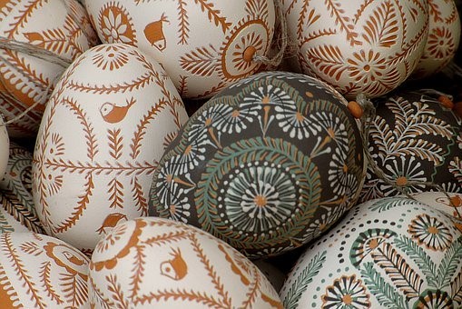 Picture 1 — What color of egg has a tree design?